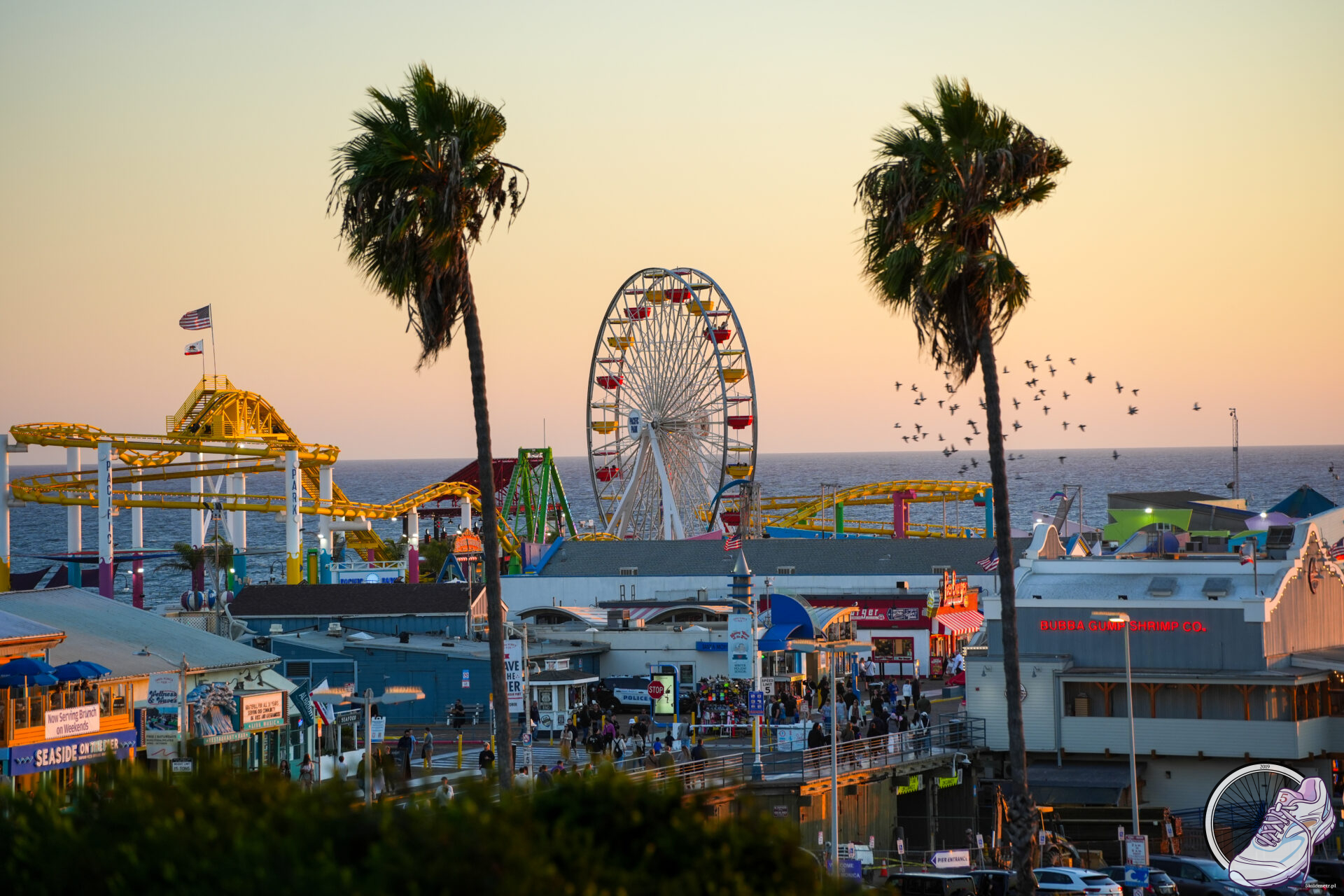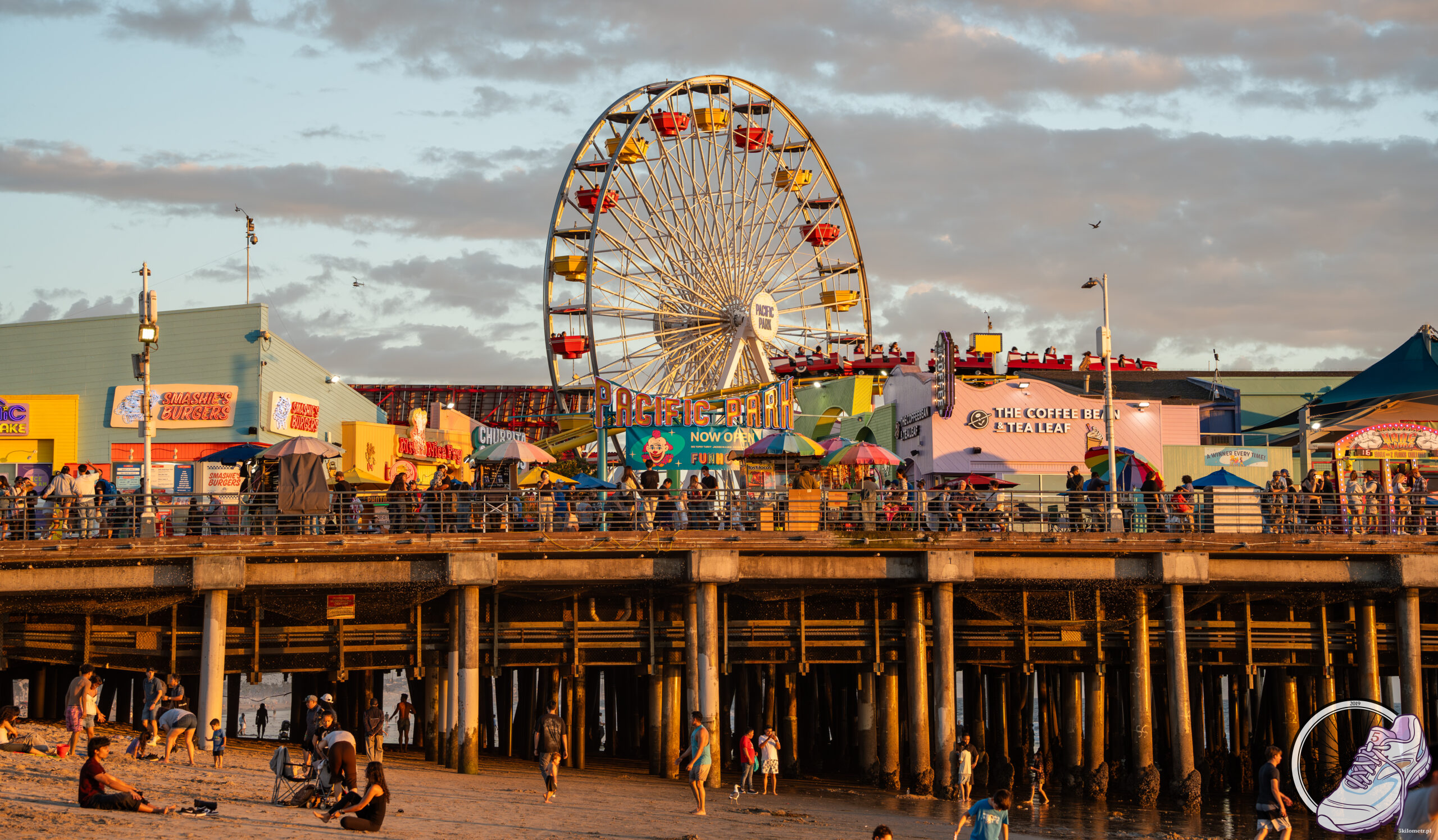 Po drodze obiad w meksykańskiej knajpie. I oczywiście porcje jak dla oddziału wojska po całym dniu manewrów. Wieczorem wróciliśmy nad ocean. Bluza do ręki, bo kalifornijskie słońce zaczęło powoli znikać za horyzontem. Zachód słońca w Santa Monica to ten moment, gdy niebo wygląda, jakby ktoś wylał na nie złoto i róż, bez umiaru i bez pytania o gust. Ludzie zwalniają, jedni siadają na piasku, inni wyciągają telefony, a ocean spokojnie odbija ostatnie promienie dnia. Przez chwilę wszystko jest dokładnie tam, gdzie powinno.