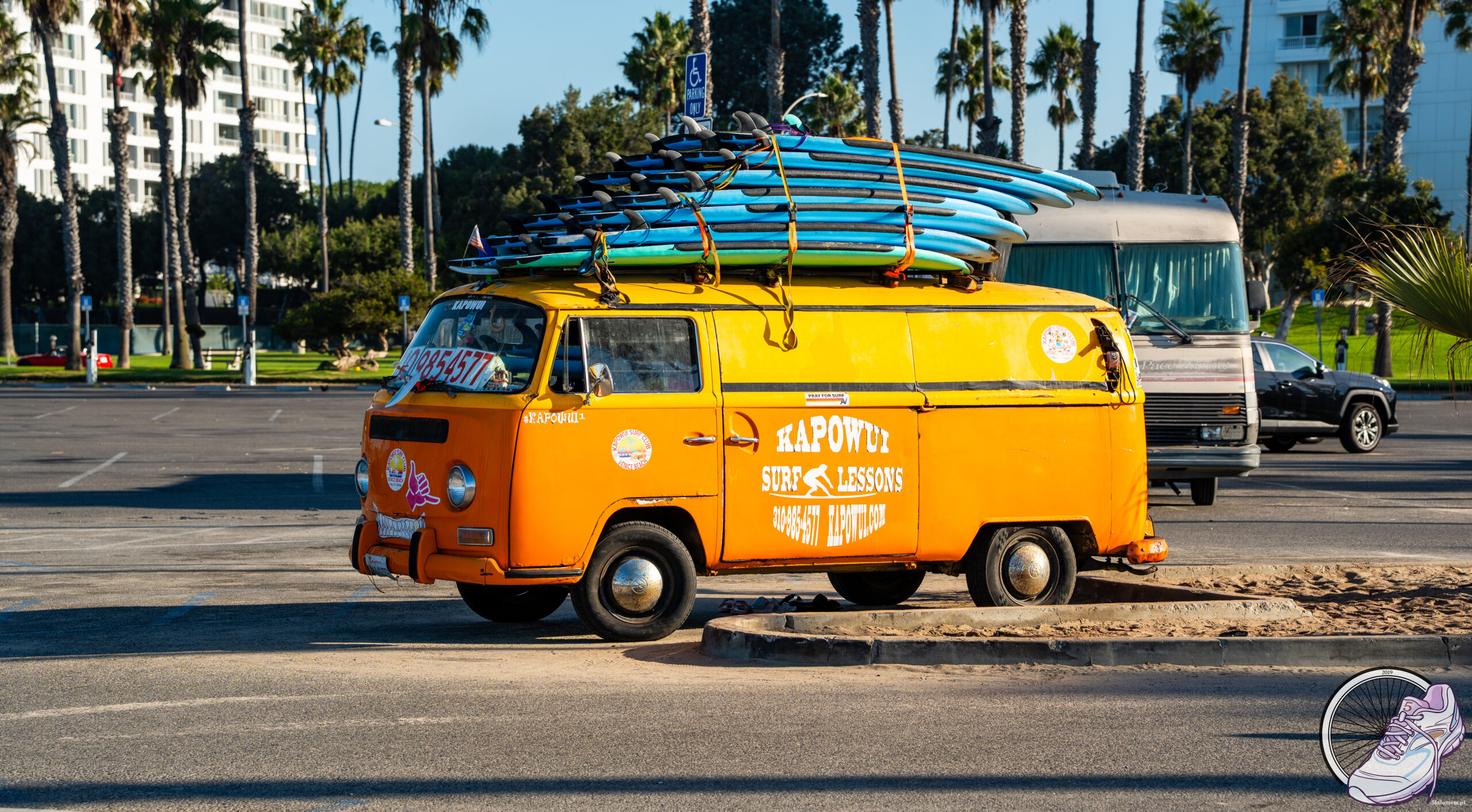 Wylot z Warszawy. Oczywiście wszystko ogarniane na ostatnią chwilę. Praca, praca i jeszcze trochę pracy. Do stolicy pojechaliśmy dzień wcześniej. Wieczorem kolacja, szybki przegląd bagaży i do łóżek. W nocy obudził nas dźwięk SMS-a: poranny lot odwołany. O co to, to nie 🙂 Ta wiadomość postawiła nas na równe nogi skuteczniej niż najmocniejsza czarna kawa. Finalnie zmienił się tylko przewoźnik i miejsce przesiadki. Zamiast Amsterdamu był Paryż, godzina wylotu bez zmian, a do Los Angeles dotarliśmy nawet szybciej, niż zakładał pierwotny plan. Sama podróż minęła spokojnie. Filmy na Netflixie, całkiem przyzwoite jedzenie. Pola spała, jadła, rysowała, naklejała i dzielnie rozwiązywała zadania z książki dla czterolatków – jak na wzorowego przedszkolaka przystało 😉 O 11:00 czasu lokalnego wylądowaliśmy w Los Angeles. Odbiór bagaży i prosto do wypożyczalni aut. Samochodu z rezerwacji nie było, więc zamiast niego wyjechaliśmy białym Bronco, dokładnie takim samym (różnił się tylko kolor), jakie Wojtek zbudował z LEGO kilka tygodni wcześniej i które do dziś zdobi naszą szafkę pod telewizorem.