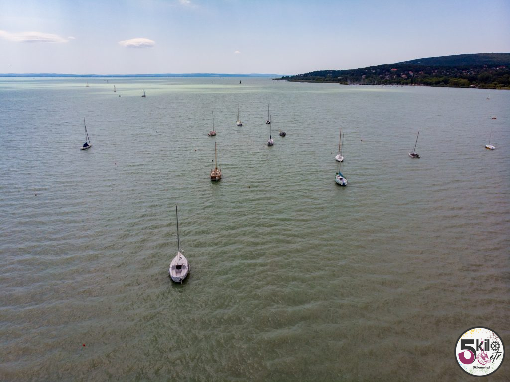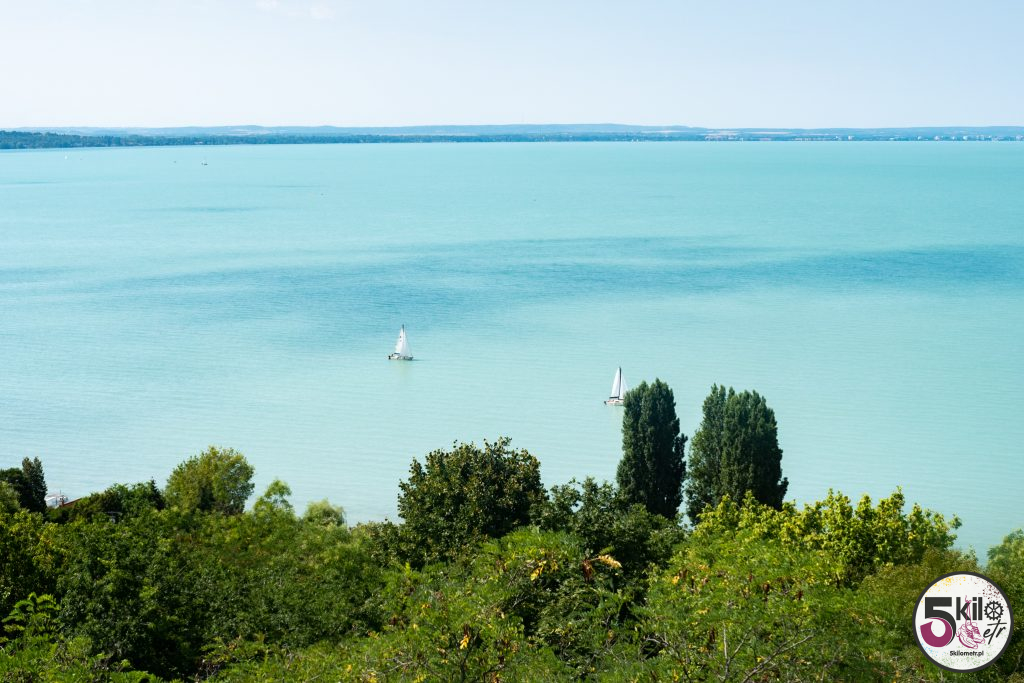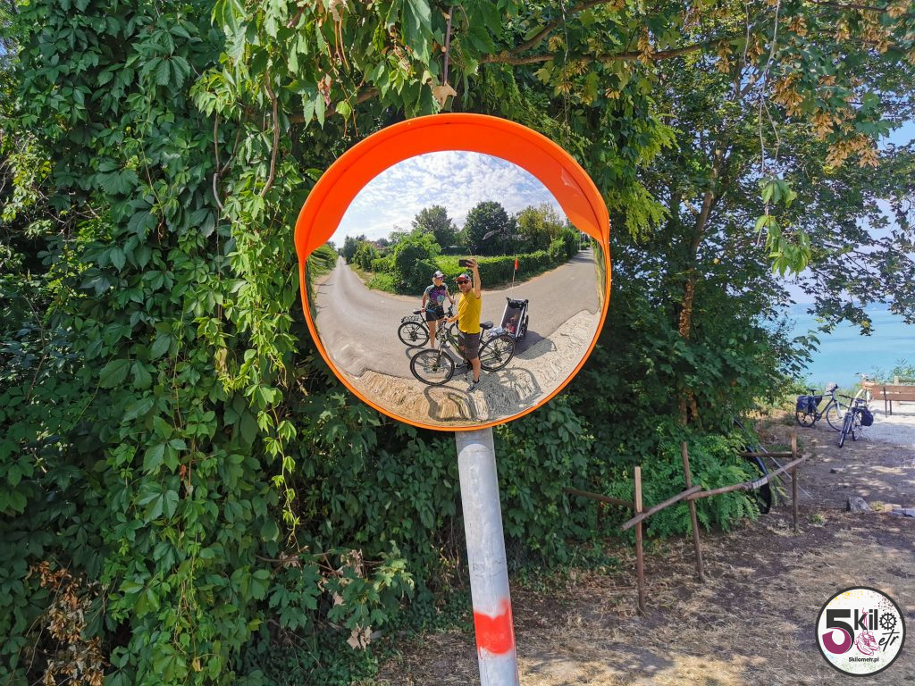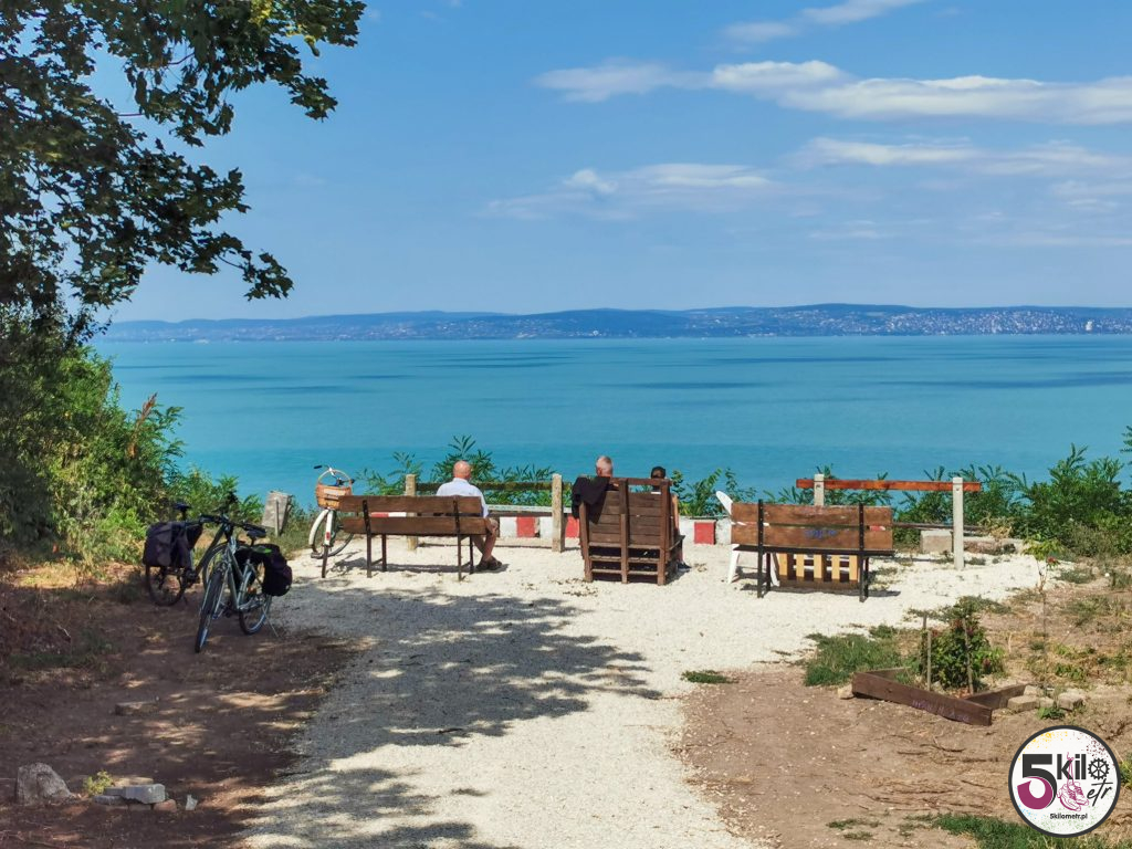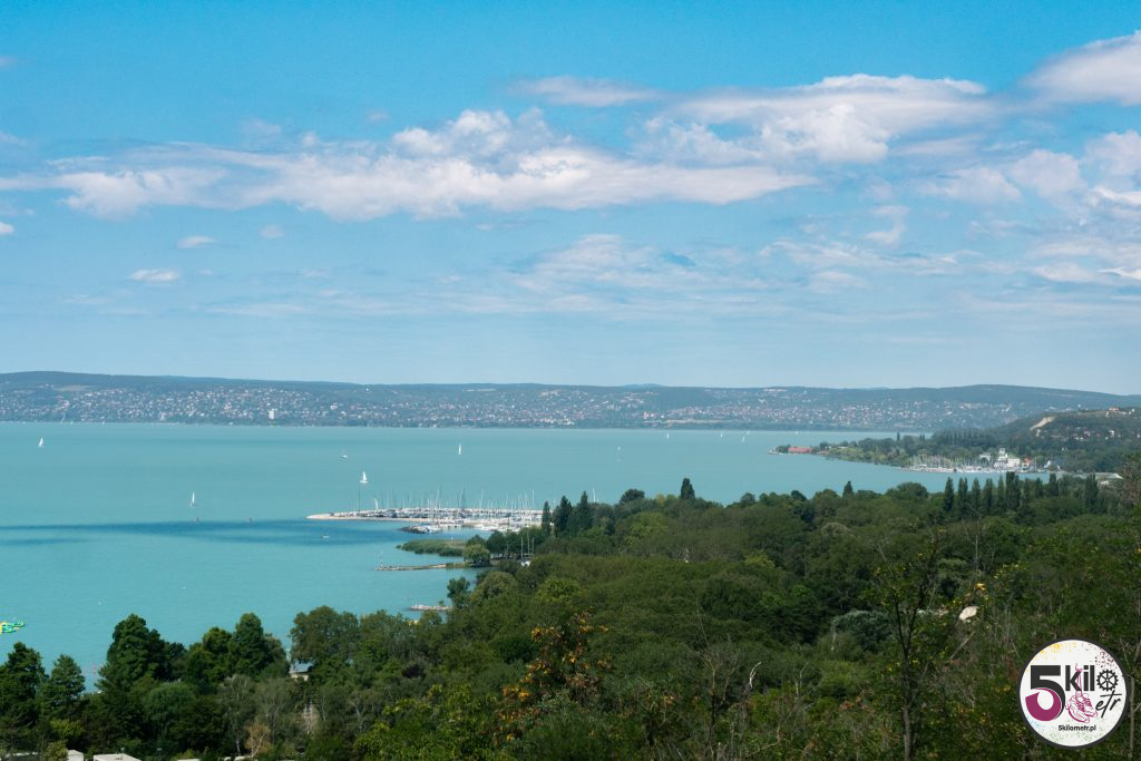 Trasę pamiętaliśmy jeszcze z poprzedniej wyprawy. Tym razem jednak nie eksperymentowaliśmy ze skrótami (ostatnio musieliśmy forsować wysoką bramę ☺️ ) tylko kierowaliśmy się żółto-zielonymi drogowskazami. Widoki przepiękne, dużo natury i jak w kalejdoskopie zmieniające się miejsca. Trasa prowadziła głównie po dobrze oznaczonych ścieżkach rowerowych (sporo odcinków zostało odnowionych). Niewiele było fragmentów, kiedy musieliśmy jechać ulicą razem z samochodami. Po niecałej godzinie kręcenia pierwszy, krótki przystanek w Balatonvilágos. Wyjątkowe miejsce z cudowną panoramą na cały Balaton. Dalej było jeszcze piękniej – mariny i łódki kołyszące się na wodzie. W takich okolicznościach przyrody nawet zwykła woda smakowała jakoś wyjątkowo ☺️ Już gdzieś po drugiej stronie jeziora przerwa na posiłek. Musieliśmy trochę zregenerować siły i uzupełnić elektrolity, bo przed nami pierwsze pagórki, winnice i Balatonfüred.