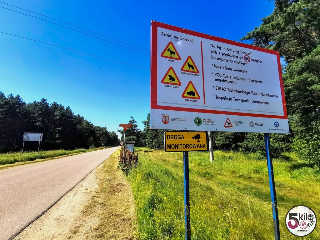 Częściej niż auta mijaliśmy innych rowerzystów, którzy powolutku kręcili kilometry wzdłuż Biebrzy (najwidoczniej nic ich nie goniło 😂). Niestety jeśli ktoś liczy na malownicze widoki, może się rozczarować. Trasa wzdłuż Carskiej Drogi biegnie głównie przez las. Oczywiście można korzystać ze ścieżek przyrodniczych, które prowadzą przez bagienne tereny. My jednak postanowiliśmy nie zbaczać z trasy i do końca trzymać się pomarańczowych znaków (do tej pory czujemy Bagna Izbickie i stronimy od podobnych atrakcji 😉).