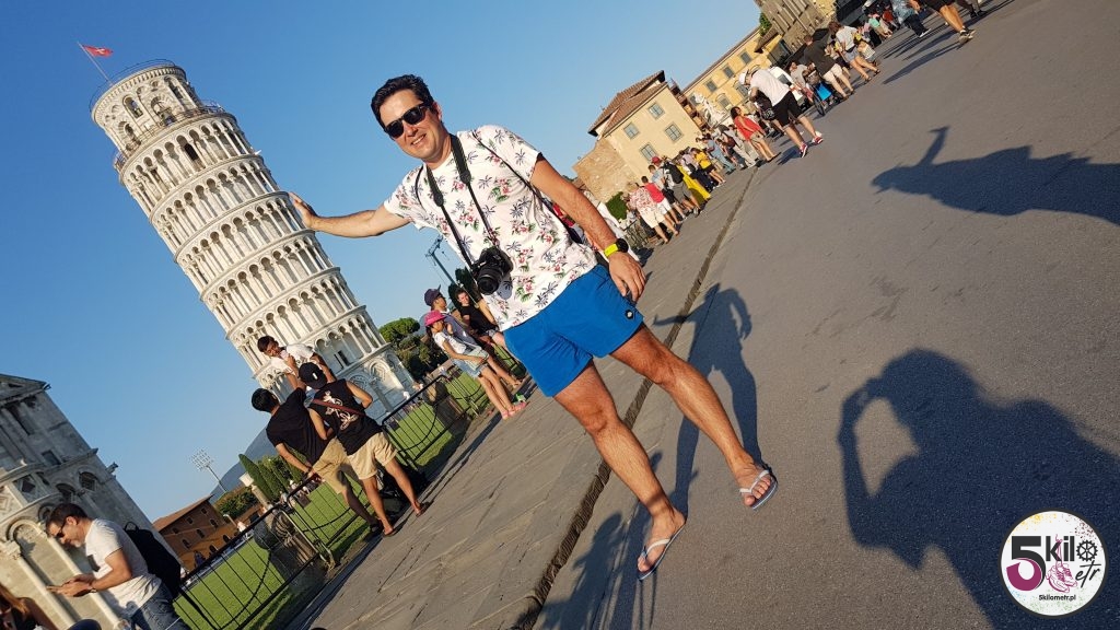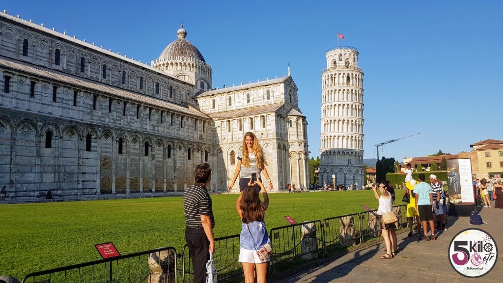 W dobrych nastrojach ruszyliśmy zwiedzać miasto. Będąc w Pizie grzechem byłoby nie cyknąć sobie typowej foty, na której „podpiera się” tamtejszą krzywą wieżę. Nie było wyjścia, my też musieliśmy mieć takie zdjęcie 😉. Krzywa wieża to fenomen w skali świata. Przecież tysiące, co ja mówię, miliony ludzi przyjeżdża do Pizy po to, by podziwiać najpiękniejszą, budowlaną fuszerkę. Dlaczego krzywa wieża jest krzywa? Zaczęła się ona odchylać od pionu już podczas budowy w 1174 rok. Wina leży w źle zbudowanych fundamentach oraz gliniastej glebie. Od momentu budowy wieża zdążyła odchylić się o około 5 m (średnio o 1 mm rocznie). Czy krzywa wieża kiedyś runie? Przewodnik mówił, że tak, ale napewno nie nastąpi to w ciągu kilku najbliższych stuleci. Macie zatem czas, aby na spokojnie przyjechać do Pizy podziwiać słynną wieże i osobiście zająć się tematem jej krzywizny.