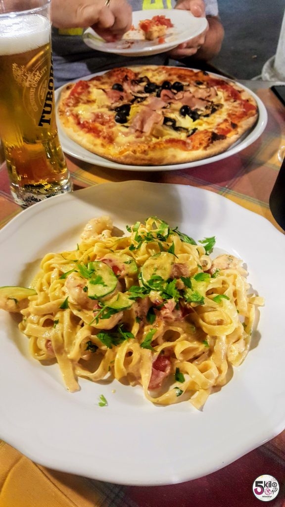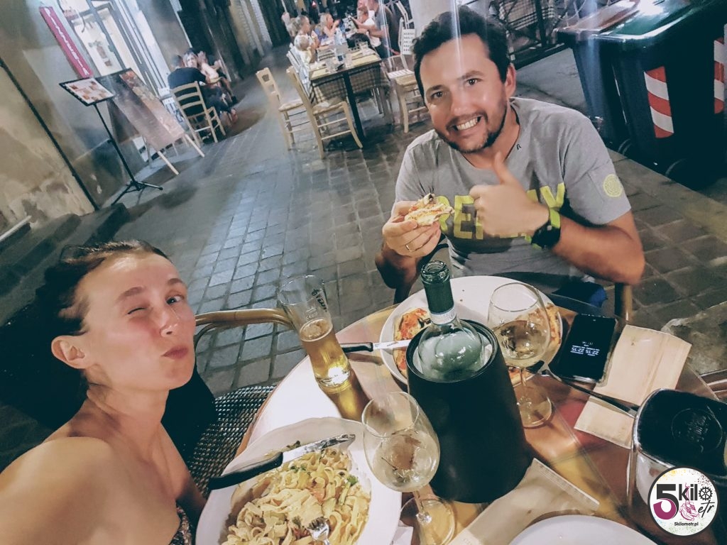 Krótki spacer po mieście i oczywiście zasłużona kolacja. Pomimo późnej pory wąskie uliczki i tak tętniły życiem. Restauracje były pełne, uliczni sprzedawcy dopiero się rozkręcali, a w powietrzu unosił się zapach świeżo przyrządzanej pizzy. Szybko znaleźliśmy przytulną knajpkę, serwującą przepyszne małże w białym winie i wyborny makaron. Przy dzbanku wina de la casa (domowej roboty) przegadaliśmy resztę wieczoru. Finalnie dzień zakończyliśmy z 70 kilometrami w nogach.