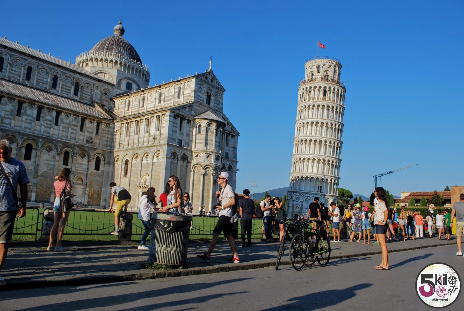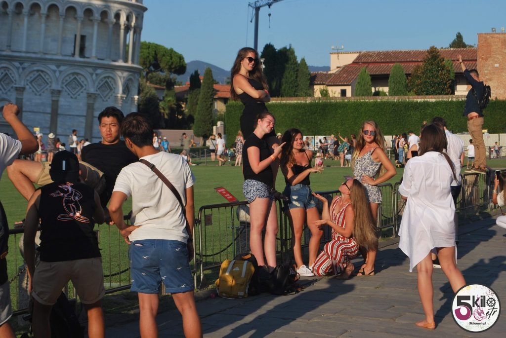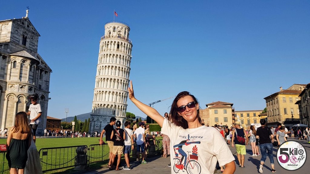 Później cały czas wzdłuż wybrzeża aż do samej Pizy. Nawet nie zdajecie sobie sprawy jakie to cudowne uczucie, gdy rower prawie sam jedzie. Na miejsce dotarliśmy jeszcze przed zachodem słońca. Rosnąca liczba turystów wskazywała na to, że pomału zbliżaliśmy się do głównej atrakcji miasta. Celem wszystkich podróżnych był ogromny plac, w którego zielony, krótko przystrzyżony trawnik, wkomponowana była krzywa wieża. Jakie wrażenia? Z jednej strony zdumienie, że pochylająca się budowla stoi i nie upada ale z drugiej małe rozczarowanie, bo myśleliśmy, że krzywa wieża jest bardziej krzywa 😉. Postanowiliśmy, że następnego dnia rozgryziemy zagadkę jej dziwnego wyglądu.