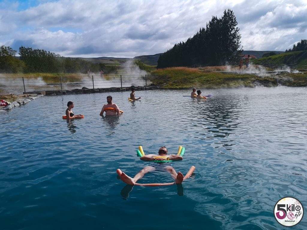 Spakowaliśmy namiot i około godziny 10 rano opuściliśmy kemping. W pierwszej kolejności gorące źródła. Największym i najbardziej znanym kąpieliskiem i SPA na Islandii jest Błękitna Laguna (Blue Lagoon). Co roku przyciąga do siebie setki tysięcy turystów. Sporo czytaliśmy o tym miejscu i finalnie zdecydowaliśmy się jednak na inną lokalizację, mniej komercyjną i mniej obleganą przez turystów. Mowa o Sekretnej Lagunie, najstarszym publicznym basenie, wybudowanym w 1891 roku. Naturalne gorące źródła znajdują się w małej wiosce Fludir. Ciepła woda utrzymuje się tam przez cały rok na poziomie 38-40 stopni Celsjusza. Na całym obszarze kompleksu znajduje się kilka miejsc geotermalnych i mały Geysir, który wybucha co 5 minut. Bilet dla osoby dorosłej to koszt rzędu 3000 islandzkich koron, czyli w przeliczeniu jakieś 96 złotych. Wokół Sekretnej Laguny były prysznice, bar i otwarta strefa wypoczynkowa.