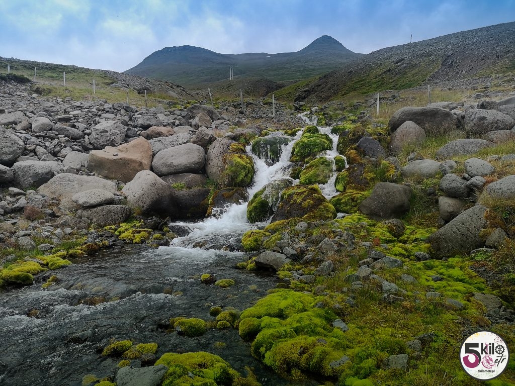 Początek spokojny (aż za bardzo 😉). To jak cisza przed jakąś burzą. Z każdym kolejnym kilometrem powoli wdrapywaliśmy się pod spore podjazdy, żeby chwilę później z nich zjechać. Dookoła kamieniste pagórki, ogromne połacie niczego a także rozciągające się doliny i pasące się na nich owce. Tym razem wiatr nie dokuczał i mogliśmy równym tempem zmierzać do mety. Na 25 kilometrze przerwa na jedzenie i uzupełnienie elektrolitów. Postój w miłych okolicznościach przyrody, przy wąskim, górskim strumyku z widokiem na małe, wijące się pośród skał wodospady. Bardzo przyjemna sceneria.