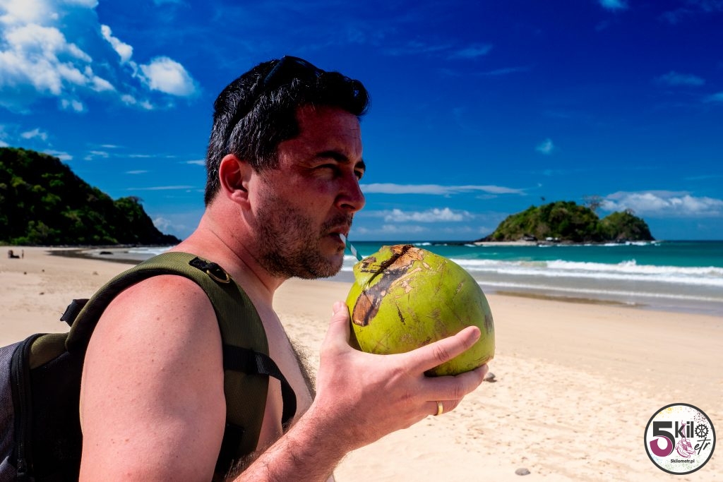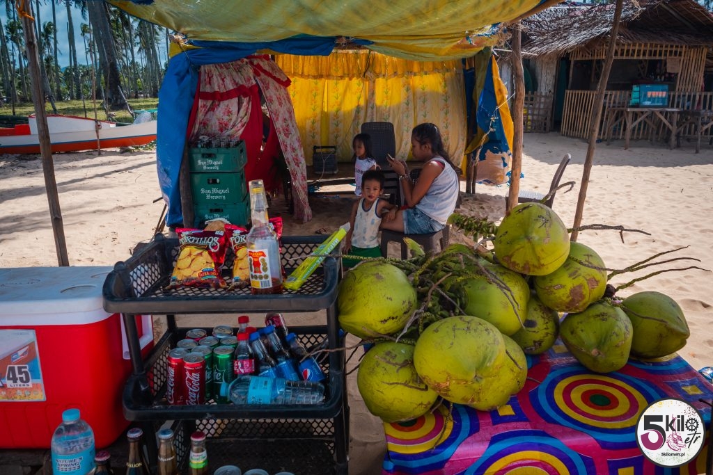 Na plaży straganiki ze świeżymi kokosami. Kilka precyzyjnych cięć maczetą i mogliśmy delektować się orzeźwiającą wodą kokosową (niecałe 50 filipińskich pesos czyli jakieś 3 zł). On jest jej wielkim fanem, ja muszę przyznać, że trochę mniej. Ale biorąc pod uwagę, że nazywana jest eliksirem życia i młodości a do tego nawadnia lepiej niż woda, skusiłam się i ja 😉