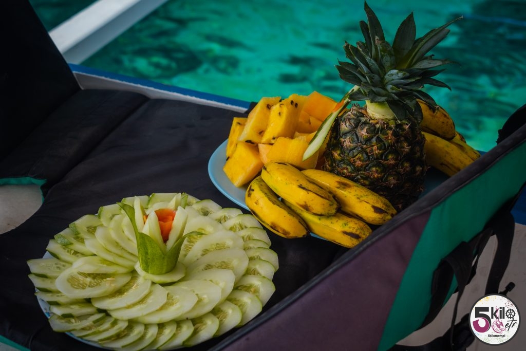 Około 13 obiad z widokiem na wyspę Shimizu (bardzo urokliwe miejsce, z piękną i jakże widokową rafą koralową). Idealna miejscówka dla każdego wielbiciela podmorskiego świat. Na stół wjechał kurczak, ryby i ryż z warzywami, a to wszystko w towarzystwie słodkich i jakże soczystych owoców (ananas był najlepszy).