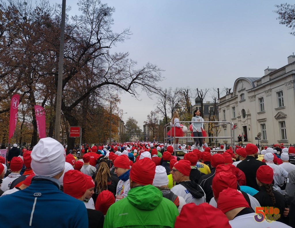 Poranek dość rześki i mglisty. Próżno było wypatrywać jakichkolwiek promieni słońca. Na linii startu 11 tys. osób a my wśród nich. Wszyscy ustawiliśmy się w strefach startowych, tworząc gigantyczną biało-czerwoną flagę biegaczy. Na początku wspólna rozgrzewka i odśpiewanie hymnu narodowego – doświadczenie i uczucie niesamowite! (szkoda tylko, że na jednej zwrotce się skończyło). Nasze nogi jeszcze bardziej rwały się do startu. Punktualnie o 11:11 start.