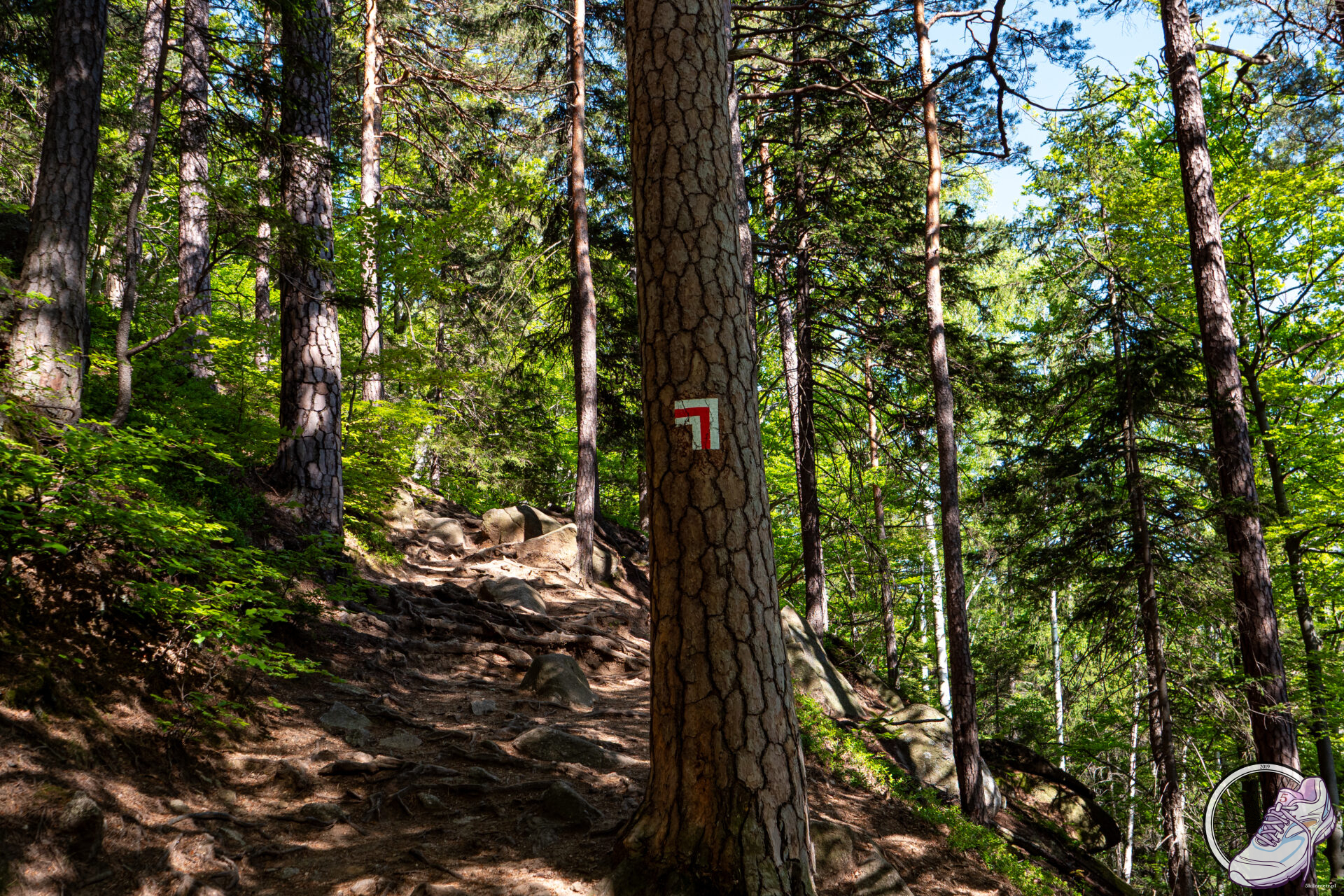 Zimą, ze względu na punktowe stromizny, raczki mogą okazać się pomocne, a wiosną i latem ścieżki bywają pokryte igliwiem, co może skończyć się efektownym poślizgiem. W pewnym momencie ja i moja mała Współtowarzyszka musiałyśmy się wspinać na czworaka i jak się okazało, wcale nie byłyśmy w tym odosobnione. Po drodze spotkałyśmy kilka osób, które również uznały ten sposób za najskuteczniejszy w drodze na szczyt 😉