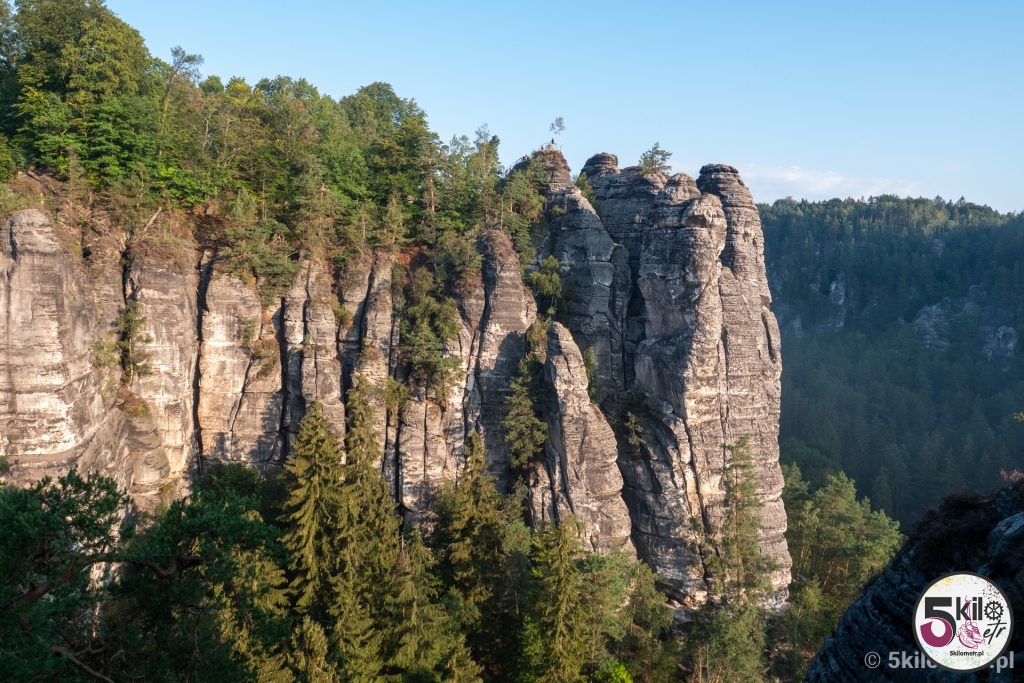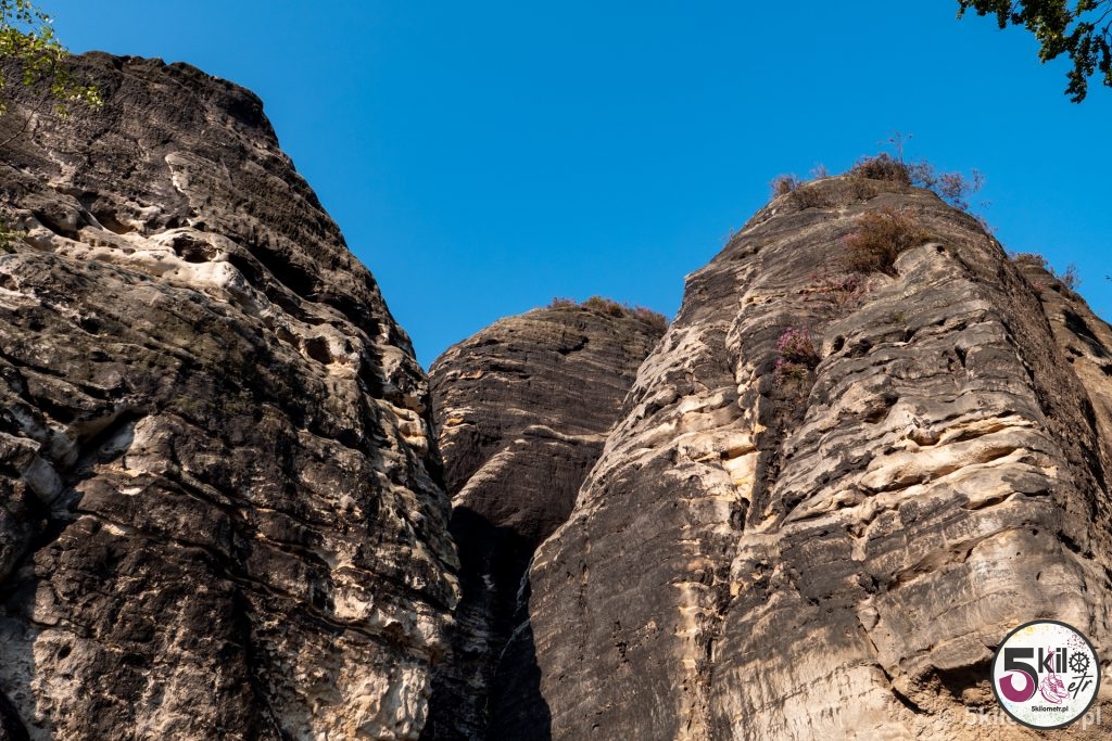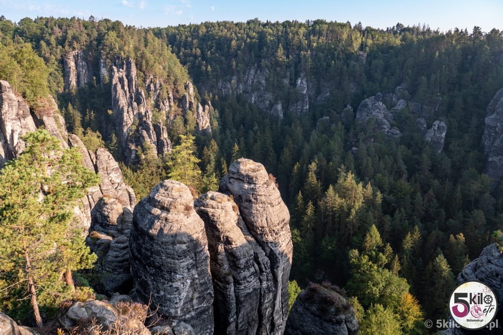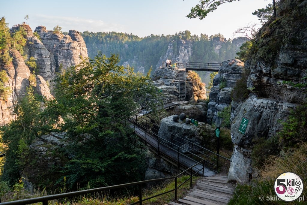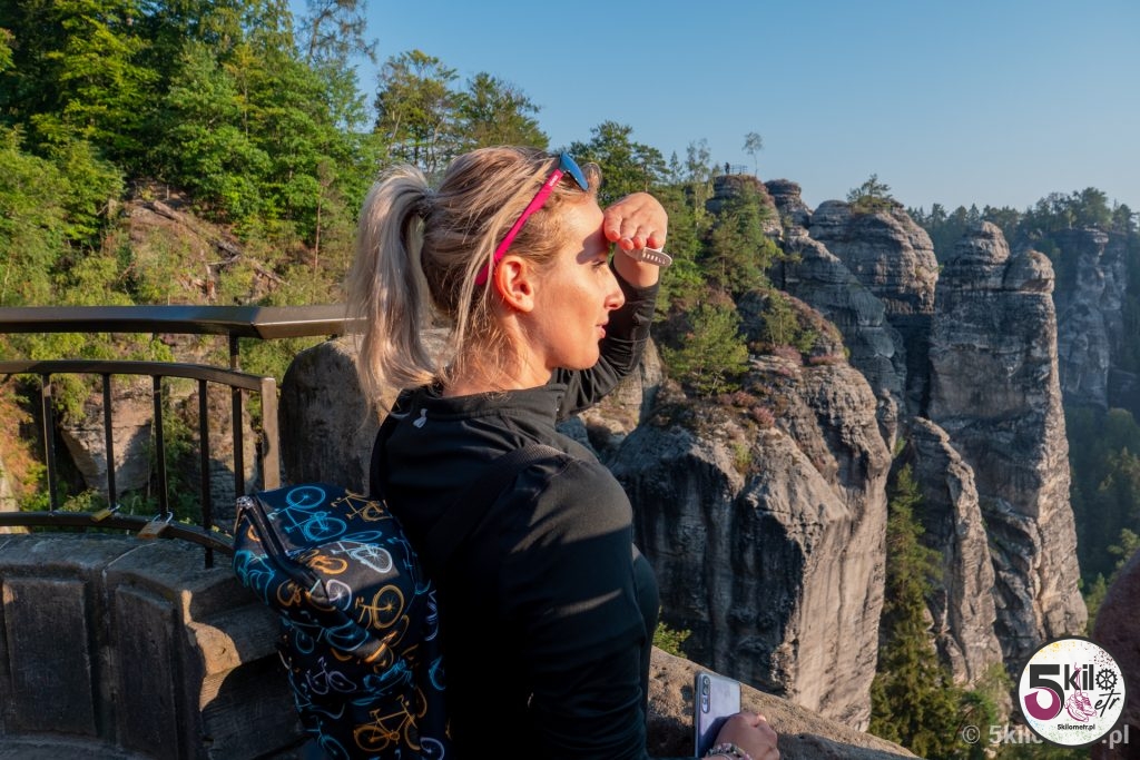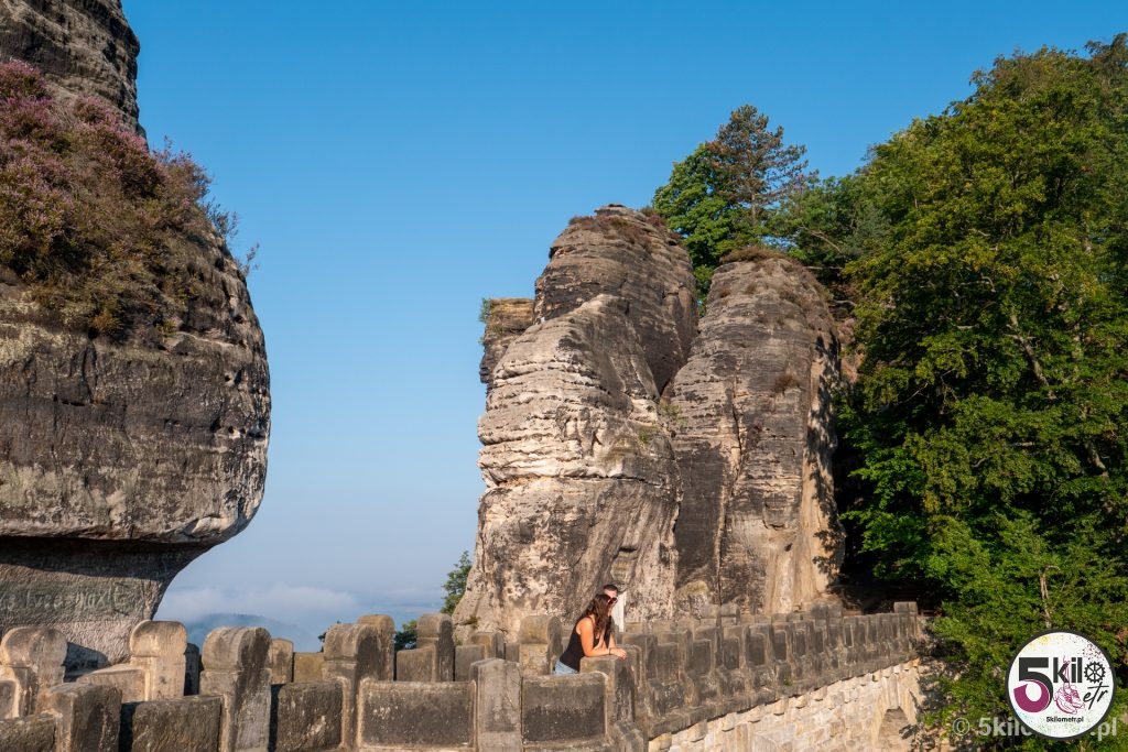 Kiedyś na szczytach skalnych stał zamek Neurathen, z którego obecnie niewiele zostało. Warto jednak wejść do jego ruin. W całym kompleksie przygotowane są specjalne platformy widokowe, które pozwalają podziwiać widok, z jednej strony na rzekę Łabę, a z drugiej na strzeliste formacje skalne. Jeśli jesteś zapalonym fotografem to koniecznie musisz tu przyjechać! Jedna tylko mała uwaga – w związku z tym, że most znajdują się na terenie Parku Narodowego Saskiej Szwajcarii, to obowiązuje zakaz puszczania dronów. I radziłabym nie lekceważyć tego obostrzenia – za jego złamanie grozi kara pieniężna w wysokości, bagatela 50 000 euro!!! Nie, nie pomyliłam się! Zer jest tyle, ile trzeba. My aż tak bogaci nie jesteśmy, więc dron przez całą wycieczkę odpoczywał w naszym plecaku 😉
